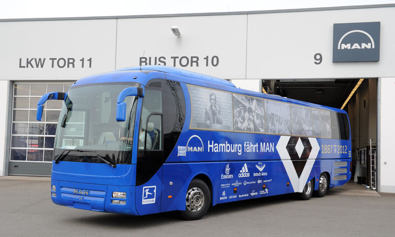 MAN ist seit zwei Jahren Partner des HSV. Bereits der bisherige Bus des Vereins, der ebenfalls „Rauten-Express“ hieß, kommt aus der Produktion von MAN. Und auch darüber hinaus ist MAN seit langem eng mit Hamburg verbunden: Weltweit jedes zweite seegehende Schiff ist mit einem Dieselmotor von MAN unterwegs. Hamburg ist daher ein wichtiger Service-Standort für Schiffsdieselmotoren, auch Turbomaschinen werden hier gefertigt. MAN beschäftigt insgesamt rund 1000 Mitarbeiter in Hamburg.