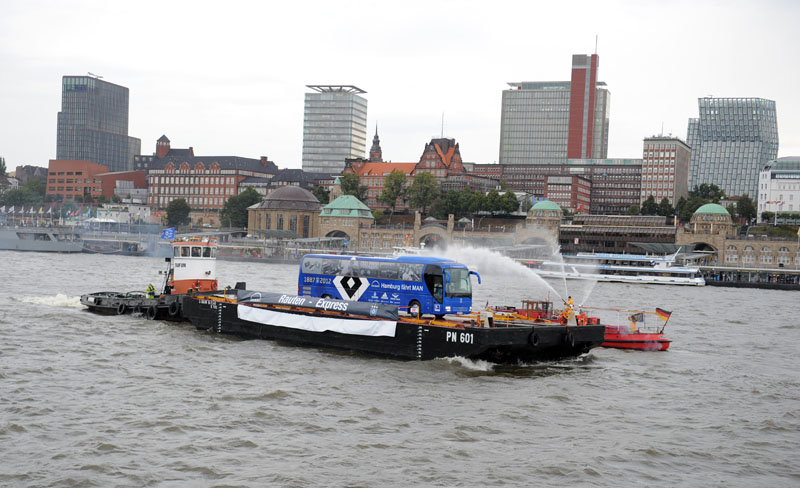 Güter aus aller Welt erreichen täglich die Hansestadt auf dem Seeweg. Dass aber ein Fußballclub seinen Mannschaftsbus per Schiff quasi frei Haus angeliefert bekommt, dürfte nicht nur für Hamburg, sondern weltweit einmalig sein. „Der 125ste Geburtstag ist selbst für einen Traditionsklub wie den HSV etwas Besonderes. Da wollten wir uns als Geschenk schon etwas Außergewöhnliches einfallen lassen“, sagte Frank H. Lutz, Finanzvorstand der MAN SE. Verantwortliche, Trainer und Spieler des HSV zeigten sich sichtlich begeistert von der Aktion: „So etwas geht eben nur an der Elbe. Ich freue mich, wieder hier zu sein“, sagte Rafael van der Vaart. Uwe Seeler zeigte sich erfreut darüber, dass die Fans ihn als Fotomotiv für den Jubiläumsbus auserkoren haben: „Natürlich ehrt es mich, dass ich von den Fans gewählt wurde. Ich hoffe, mit dem neuen Bus fährt der HSV viele Punkte nach Hause.“