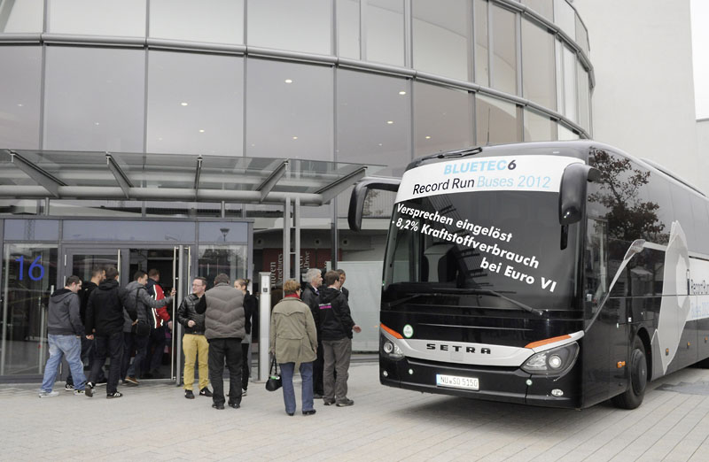 Dass die von Setra prognostizierte Reduzierung des zukünftigen Kraftstoffverbrauchs nun auch verbrieft und besiegelt ist, bewies der vor wenigen Wochen durchgeführte Record Run Buses 2012. Über die Ergebnisse konnte man sich an einem Sonderstand unterrichten lassen, an dem auch das Testfahrzeug mit allen Messinstrumenten zu besichtigen war. Der S 515 HD verbrauchte 8,2 Prozent Diesel weniger als sein Vorgänger. Des Weiteren nahmen zahlreiche Gäste die Angebote wahr, die neuen Reisebusse der ComfortClass 500 bei Probefahrten selbst zu erleben und zu erfahren, die nahe Omnibus-Fertigung zu besichtigen sowie an Demonstrationen des erweiterten Notbremsassistent Active Brake Assist (ABA2) teilzunehmen.