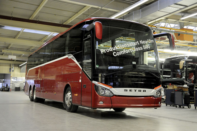 Mit der ComfortClass 500 präsentierte die Ulmer Omnibusmarke Setra Ende vergangenen Jahres das weltweit erste komplett unter Euro VI-Anforderungen entwickelte Reisebuskonzept. Ab Mitte Februar beginnen nun im EvoBus Werk Neu-Ulm die ersten Kundenauslieferungen der CC500 mit einem S 517 HD der sechsten Setra Reisebusgeneration. „Nach Abschluss der Entwicklungsphase geht mit der neuen Baureihe ein wichtiges Teilprojekt in die Serie, die wir erfolgreich in den bestehenden Fertigungsmix einbinden konnten“, unterstrich Wolfgang Hänle, Geschäftsführer Produktion Daimler Buses, die große Bedeutung der ComfortClass 500 für die Zukunftssicherung der Standorte. Auch nach dem Start der neuen Euro VI-Fahrzeuge werden in Neu-Ulm weiterhin Busse mit der noch gültigen Euro V-Technologie gefertigt.