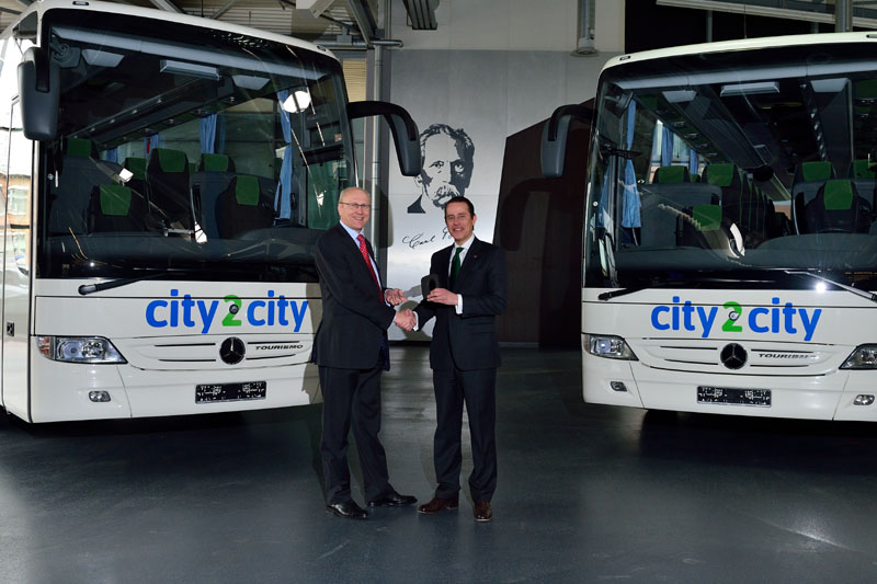 Am 2. April 2013 geht die National Express Germany GmbH unter der Marke city2city mit einem neuen Fernliniennetz in Deutschland an den Start. Die National Express Germany GmbH ist eine hundertprozentige Tochter der National Express Group, ein international agierendes Transportunternehmen aus Großbritannien und gleichzeitig der größte europäische Fernbus-Betreiber. Unter dem Motto „Besser mit dem Bus!“ möchte city2city neuen Komfort und die modernste Busflotte Deutschlands zu besonders freundlichen Fahrpreisen anbieten. Die Fernbusse sollen Passagieren entspanntes Reisen mit individueller Unterhaltung oder mobilem Arbeiten an Bord ermöglichen. Mit wenigen Zwischenstopps auf den Strecken sollen direkte Metropolverbindungen ohne zeitraubendes Ein- und Aussteigen geschaffen werden. Bestandteil des Konzeptes: die Marke Mercedes-Benz. Denn zum Einsatz kommen ausschließlich neue Busse des Mannheimer Omnibus-Herstellers.