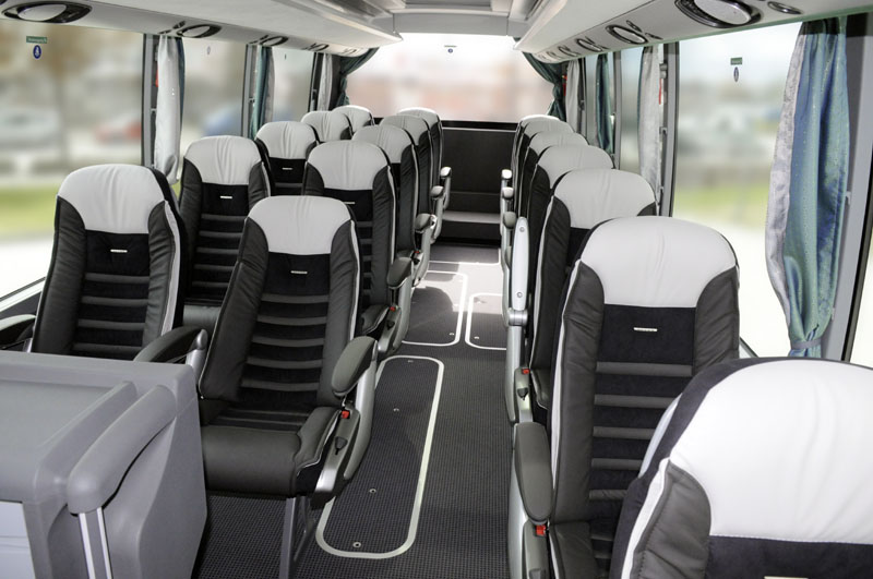 Der Tourismo zählt zu den beliebtesten Mercedes-Benz Reisebussen aller Zeiten. Seinen Erfolg verdankt er der klaren Ausrichtung als besonders wirtschaftlicher und sicherer Reisebus mit vielen Individualisierungsmöglichkeiten durch ein großes Sonderausstattungspaket. Flexibilität, die Fernlinienbetreiber zu schätzen wissen. Bei allen 15 Tourismo M wurde das Augenmerk auf das Innere der Fahrzeuge gelegt. Für das bordeigene Unterhaltungsprogramm sorgen eine Audio- und Videoanlage mit CD/DVD-Player und aufschaltbarer Navigationsanzeige sowie zwei 48,26 cm (19") große TFT-Bildschirme. Der hochwertige Travel Star Xtra (TSX) mit Softline-Polsterung im 4-Sterne-Sitzabstand vermittelt ein luxuriöses Ambiente. Jede Doppelsitzreihe verfügt wandseitig über eine 230-Volt-Bordsteckdose und dient als Ergänzung zum kostenfreien WLAN-Netz, das Surfen und Mailen während der Reise ermöglicht. Eine leistungsstarke Aufdachklimaanlage mit 32 kW Leistung und zusätzlicher Fahrerarbeitsplatzklimatisierung gehören ebenso zur Fernlinienausstattung wie die wassergespülte Bordtoilette. Um das ohnehin schon üppige Sicherheitspaket bestehend aus ABS, ASR und ESP in Richtung aktive Sicherheit abzurunden, wurde am Fahrerarbeitsplatz ein Atemalkohol-Messgerät mit Wegfahrsperre installiert. Vor jeder Fahrt fordert das System den Fahrer zur Abgabe einer Atemprobe auf, mit der er bestätigt, dass er uneingeschränkt fahrtauglich ist. Das Messergebnis der Atemalkoholkonzentration entscheidet darüber, ob der Anlasser des Fahrzeugs freigeschaltet wird und damit der Motor gestartet werden kann.