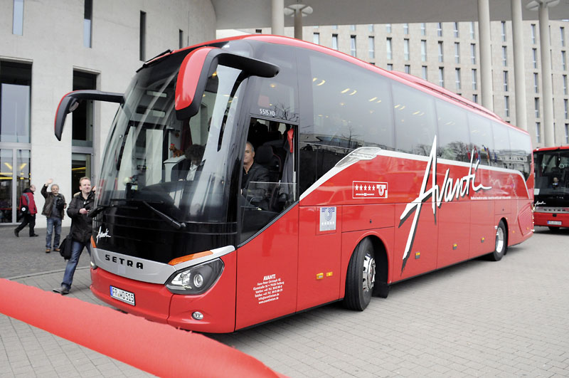 Auf der 52 000 Kilometer langen Strecke warten holprige Straßen, lange Autobahnfahrten, kaltes und heißes Klima auf Fahrzeug und Passagiere, die sich auf einen Reisebus mit herausragenden Fahreigenschaften und größtmöglichen Komfort- und Sicherheitseinrichtungen verlassen können. Mit der modernen und umweltfreundlichen Technik der ComfortClass 500 können die Gäste die Traumreise in fünf Etappen und durch 26 Länder so bequem wie möglich genießen. Der mit fünf Sternen klassifizierte und 12,3 Meter lange Zweiachser ist mit 40 Leder-Reisesesseln ausgestattet – und bietet so den Fahrgästen viel Beinfreiheit. Zudem wertet eine Vis-à-vis-Bestuhlung mit Tischen das Ambiente auf. Mit an Bord ist Avanti-Geschäftsführer und Initiator Hans-Peter Christoph, der mit Reisebussen der Setra TopClass 400 schon zwei Mal problemlos vom Breisgau nach China gereist war. So war für ihn klar, dass auch für dieses ehrgeizige Projekt ausschließlich ein Fahrzeug von Setra in Frage kam. „Ich bin mir sehr sicher, dass wir unseren Bordtechniker so gut wie nie benötigen werden“, sagte der Weltenbummler Anfang März bei der Abholung des S 515 HD im Neu-Ulmer Setra Kundencenter. Heinz Friedrich, Markensprecher Setra Deutschland, zeigte sich bei der feierlichen Übergabe begeistert, dass es Unternehmen mit Visionen gibt: „Wir sind sehr stolz, dass wir mit dem Besten von Setra, einem Bus der ComfortClass 500, Partner dieser modernen Pioniertat sein dürfen. Bei dieser Gelegenheit wird unsere neue Busgeneration ihre überlegenen Eigenschaften Beweisen.“
