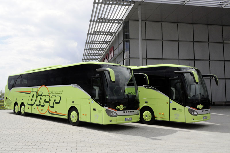 Neben der ausgefeilten Omnibustechnik, der hochwertigen Komfortausstattung sowie einem umfangreichen Service-Paket spielte für den Busunternehmer bei der Vertragsunterzeichnung auch die langjährige freundschaftliche Geschäftsbeziehung zum Setra Vertriebsteam eine große Rolle. Die mit vier Sternen klassifizierten Fernreisebusse S 516 HD und S 517 HD bieten 50 beziehungsweise 52 Passagieren Platz, die es sich auf Reisesesseln des Typs Setra Voyage mit Armlehnen und Lederkopfteilen bequem machen können. Neben einer Bordküche mit 40 Tassen-Behälter sorgt unter anderem auch eine Audio-/Videoanlage mit DVD-Abspielgerät für ein entspanntes und unterhaltsames Reisen. Die neuen Setra Busse sind mit den modernsten Fahrerassistenz-Systeme ausgestattet, die derzeit in der Branche erhältlich sind. Mit an Bord sind unter anderem ein Abstandsregel-Tempomat (ART) und ein Notbrems-Assistent (ABA) sowie das exklusive Sicht-Paket, das unter anderem BiXenon-Scheinwerfer für Abblend- und Fernlicht, eine Scheinwerfer-Hochdruck-Waschanlage sowie eine Umfeldbeleuchtung für Rückwärtsfahrten beinhaltet.