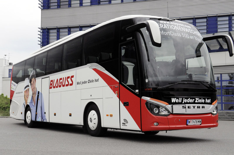 Die ComfortClass 500 wird auf den Fernlinien sowie im europäischen Reiseverkehr des traditionsreichen burgenländischen Familienunternehmens eingesetzt. Die Gäste können es sich auf 49 Reisesesseln mit Fußstützen, Armlehnen und Leder-Kopfteilen bequem machen und sich mit Snacks und Getränken aus der Bordküche stärken. Verlängerte Sitzplatzpodeste schaffen Raum für noch mehr Bewegungsfreiheit und somit zusätzlichen Komfort für die Reisenden. Unterhaltung und Information pur garantiert die Audio-/Videoanlage des Coach Multimedia Systems mit DVD-Abspielgerät, ipod- und iphone-Anschluss sowie freier W-Lan-Verbindung. Bei der Ausstattung des S 515 HD bewies Blaguss den Blick fürs Detail. Mit einem Ladewechselrichter stehen im Standbetrieb oder auch während der Fahrt 220 V-Anschlüsse zum Aufladen elektronischer Geräte aller Art zur Verfügung. Das Busunternehmen Blaguss blickt auf eine lange und sehr erfolgreiche Firmengeschichte zurück. Ins Leben gerufen wurde das ursprüngliche Lohnfuhrwerksgewerbe im Jahr 1929 von Paul Blagusz. Im Mai 1970 erfolgte die Gründung der „Blaguss Reisen Gesellschaft m.b.H“. Heute wird Blaguss als zweitgrößtes privates Busunternehmen Österreichs mit Tochterfirmen in Ungarn, der Slowakei und Tschechien von der Familie Dr. Robert Blaguss, Mag. Thomas Blaguss und Mag. Paul Blaguss geführt. Der Fuhrpark umfasst etwa 330 Fahrzeuge, die im Jahr nahezu 16 Millionen Kilometer auf nationalen und internationalen Linien zurücklegen. Das Durchschnittsalter der Busse beträgt zweieinhalb Jahre. Seit dem Jahr 1978 übernahm das 550 Mitarbeiter zählende Unternehmen fast 900 Busse der Ulmer Traditionsmarke Setra.
