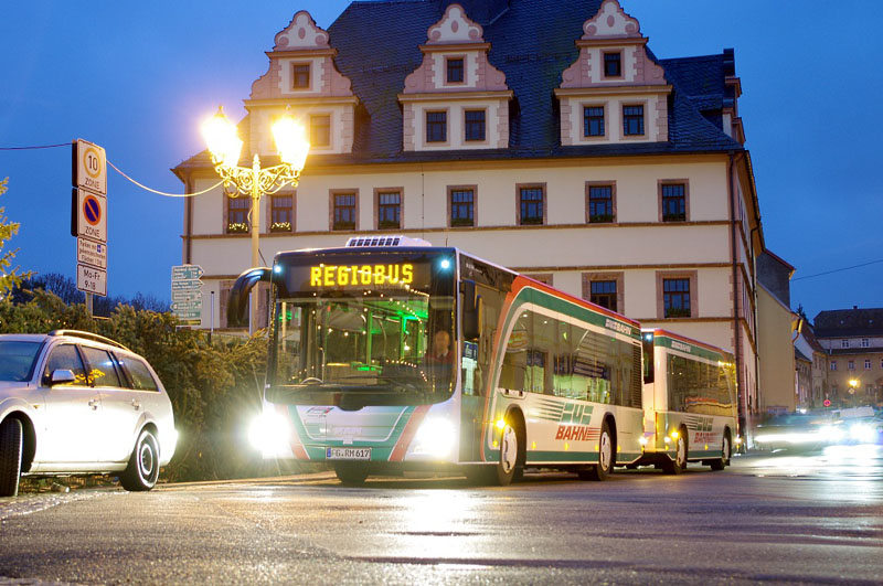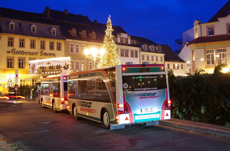 Die damals zu diesem Zweck neu beschafften Mercedes-Benz O 530 GÜ (Citaro) verkehrten anfangs Montag bis Sonntag zwischen Glauchau und Geithain (Linie 629) im Zwei-Stunden-Takt. Das 18 Meter lange Gefährt hielt 44 Sitz- und 60 Stehplätze bereit und war mit vielen Extras ausgestattet: Eine ansprechende und auffällige Farbgebung, eine moderne, feste Bestuhlung mit dem Komfort eines Reisebusses, zusätzliche feste Fahrradständer in Höhe des üblichen Kinderwagenstellplatzes, ein WC und einen Snack-Automat. Diese für einen Niederflurbus unüblichen Ausstattungen haben sich nicht alle bewährt. So wurde der Snack-Automat aufgrund der hohen Geräuschpegel (nicht nur während der Fahrt auf schlechteren Straßen) ausgebaut. Die Linie wurde zudem Montag bis Freitag in Penig gebrochen: Regiobus fuhr den Großteil der Strecke über Rochlitz nach Geithain und die Regionalverkehrsbetriebe Westsachsen GmbH aus Zwickau bedienten über ihre Glauchauer Niederlassung den Linienast von Glauchau über Waldenburg nach Penig. An Wochenenden kamen schon nach wenigen Jahren aufgrund der mangelnden Auslastung auf der kompletten Strecke nur noch Kleinbusse zum Einsatz. Die vor elf Jahren extra beschafften Gelenkbusse haben sich nunmehr auf Dauer für die unterschiedlichen Fahrgastströme nicht als flexibel genug gezeigt und wurden bei Sanierungsmaßnahmen teilweise schon zu "normalen" Gelenkbussen umgebaut und umlackiert. Die erst am Freitag vom Hersteller im nahen Ehrenhain (Thüringen) übernommenen Göppel Midi-Train wurden der Öffentlichkeit erstmals am 30.11.2013 am Weihnachtsmarkt in Penig vorgestellt, als damit gleich drei Weihnachtsmänner für den traditionellen Markt zur Eröffnung desselben vorfuhren. Am heutigen Sonntag wurden zudem für die Bevölkerung zwischen 14 und 17 Uhr kostenlose Rundfahrten durch Penig angeboten, um die Zugfahrzeuge vom Typ MAN/Göppel A35 (NM 293 F) und Anhänger Goldhofer/Göppel G10 kennenlernen zu können. Neu beschafft wurden für die "Busbahn" drei Zugfahrzeuge für zwei Anhänger mit einigen Besonderheiten: Eine bequeme Bestuhlung mit "Lümmelecke" im Heck, einem hinterleuchteten REGIOBUS-Logo in der Dachvoute des Zugfahrzeuges und Anhängers gegenüber der Mitteltür des Zugfahrzeuges und der Doppeltür des Anhägers.