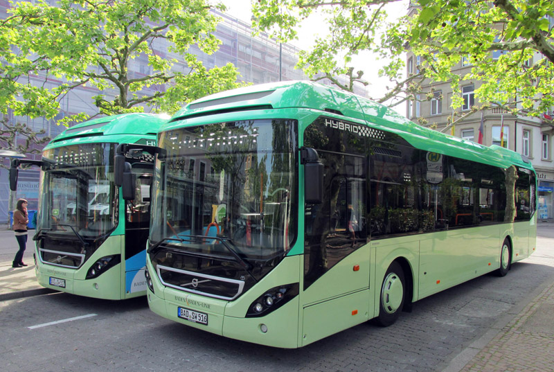 Die 12 m langen, zweiachsigen Niederflur-Hybrid-Solobusse Volvo 7900 H verfügen über einen Parallelhybrid-Antrieb. Beim Verlassen der Haltestellen erfolgt das Anfahren stets ruckfrei, emissionslos und nahezu geräuschlos im Elektromodus. Mit den neuen Hybridbussen führt die Stadt Baden-Baden ihre Klimaschutzoffensive „Baden-Baden setzt auf 37" fort, mit der sie bis zum Jahr 2020 den klimaschädigenden CO2-Ausstoß um insgesamt 37 % verringern will. „Die Anschaffung der Hybridbusse ist ein weiterer Schritt zum Ausbau der Elektromobilität, die ein wichtiger Teil unserer Klimaoffensive ist. Mitentscheidend war dabei natürlich auch die finanzielle Unterstützung durch das Land Baden-Württemberg", meint Bürgermeister Werner Hirth. Die Hybridbusse sollen überwiegend in der Innenstadt eingesetzt werden und dort so oft wie möglich rein elektrisch fahren. „Wir wollen mit dem Hybridantrieb trotz der schwierigen Topografie mit vielen bis zu zehnprozentigen Steigungen bei jedem Bus rund 30 % des Kraftstoffverbrauchs und rund 50 % der schädlichen NOx- und CO2-Emissionen im Vergleich zu unseren Dieselbussen einsparen", erklärt BBL-Betriebsleiter Wolfgang Droll. Ausgerüstet sind die neuen Hybridbusse mit dem stehenden Diesel-Reihenmotor D5K240 und 177 kW/240 PS Leistung, kombiniert mit einem 120-kW-Elektromotor. Dieser funktioniert während der Fahrt als Generator, der für die Rückgewinnung der Bremsenergie und damit die Aufladung der Batterien sorgt. Bei Bremsvorgängen wirkt er zudem als Retarder. Geschaltet wird weich über das automatisierte Volvo I-SAMGetriebe mit 12 Gängen. Bei jedem Fahrzeugstillstand schaltet der Dieselmotor ab, das Anfahren erfolgt elektrisch. Fährt der Bus langsamer als ca. 17 bis 22 km/h, bewegt er sich rein elektrisch voran. Ist der Batterie-Ladestand auf 75 Prozent gefallen, schaltet sich der Dieselmotor wieder hinzu. Im Stadtverkehr können die Hybridbusse ihre Vorteile voll ausspielen: Das häufige Bremsen und die vielen Anfahrvorgänge an Haltestellen und Ampeln liefern viel Energie für den Batteriespeicher. Neben ökologischen Aspekten und innovativem Parallelhybridantrieb steht bei den neuen Volvo-Hybridbussen der BBL vor allem der Fahrgastkomfort im Fokus: Im Innenraum sind die zweitürigen Volvo 7900 H in den Farbtönen Grau und Minze gehalten und mit einem rutschsicheren Fußboden in grau-blauer Optik ausgestattet. Das blendungsfreie Tagfahrlicht, die gut lesbaren LAWO-Fahrtzielanzeigen und die gesamte Innenbeleuchtung basieren auf einem energiesparenden LED-Lichtkonzept. Für ein angenehmes Klima an Bord der Hybridbusse sorgen eine Dachkanalheizung, eine Konvektorenheizung, eine 30-kW-Zusatzheizung und zwei elektrisch öffnende Dachluken. Über Fahrermikrophon, Lautsprecher sowie zwei Monitore im Vorbau und im Mittelgang können wichtige Informationen schnell an die Fahrgäste vermittelt werden. Der Arbeitsplatz des Fahrers verfügt über einen luftgefederten Fahrersitz mit Sitzheizung, Fahrerplatz-Klimaanlage, VDV-Instrumententafel, CD-Radio und Sonnenrollo. Beide Hybridfahrzeuge sind mit einem Kienzle-Unfalldatenspeicher ausgestattet. Durch die serienmäßige Kneeling-Einrichtung lässt sich die Einstiegsseite des Volvo 7900 H über die gesamte Buslänge hinweg um rund 70 mm absenken und ermöglicht so einen bequemen Zugang auch für Senioren oder Eltern mit Kinderwagen. Für Personen, die in ihrer Mobilität eingeschränkt sind, stehen darüber hinaus eine Rollstuhlrampe und ein großzügig dimensionierter Stehperron an der mittleren Einstiegstür zur Verfügung.