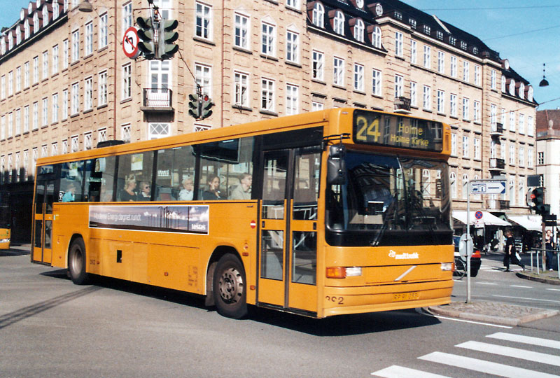 | Die Volvo B10M mit Aabenraa-Aufbau verfügen über einen Hochflurinnenraum mit je einer Doppeltür vorne und hinten, wobei der Fahrgastfluss von hinten nach vorne erfolgt. Wagen 392 befährt nahe des Rathauses die Park Alle in Richtung Bahnhof. | ||
