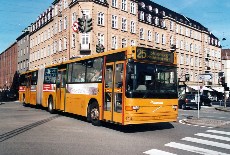Aus der gleichen Generation setzt Århus Sporveje auch Gelenkbusse des Typs Volvo B10MA mit Aabenraa-Aufbau ein. Bei diesen erfolgt der Einstieg über die mittlere, der Ausstieg durch die vordere und hintere Tür, wie die grünen und roten Markierungen zeigen. | ||