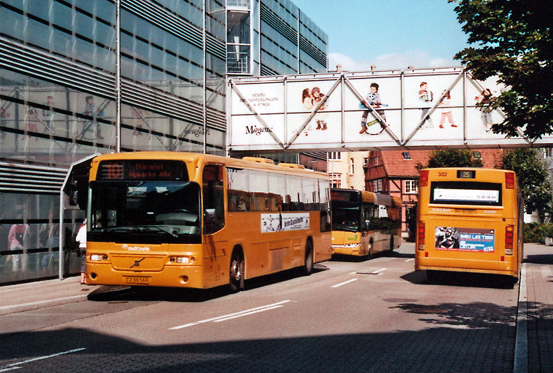 | Vom Bahnhof nördlich durch die Innenstadt verkehren die Linienbusse auf einer eigenen Bustrasse. In deren Verlauf liegen mehrere Haltestellen wie jene an der Emil Vetts Passage, an der sich ein Volvo B12M mit Aabenraa-Aufbau und zwei weitere Busse treffen. | ||