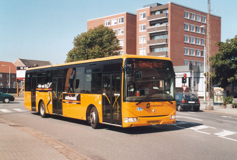 Der als Wagen 7349 geführte Irisbus Crossway LE biegt am westlichen Rand der Innenstadt soeben in die Skolegade ein. Farbgebung und Beschriftung der Fahrzeuge sind von der Regiegesellschaft Sydtrafik vorgegeben. | ||