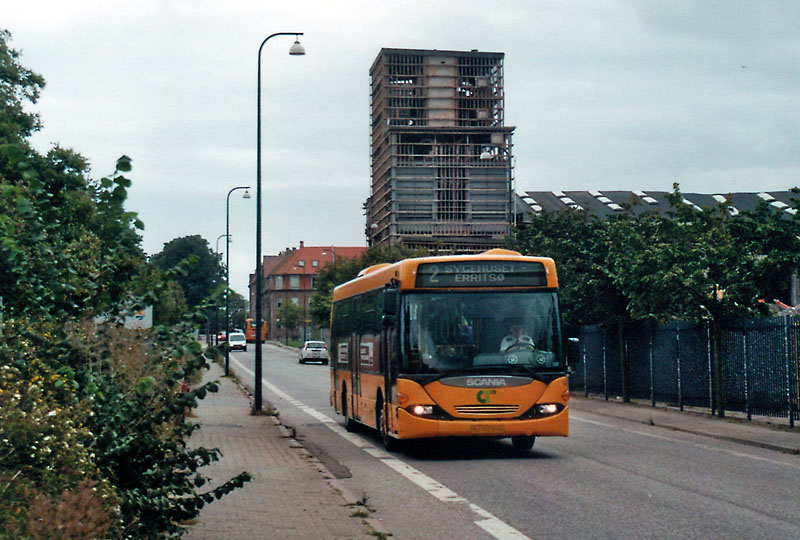 Ebenfalls auf der Oldenborggade, aber in Gegenrichtung unterwegs ist der OmniLink mit der Wagennummer 143. Rechts im Hintergrund liegt ein großes ehemaliges Chemiewerk, das zur Zeit abgerissen wird. | ||