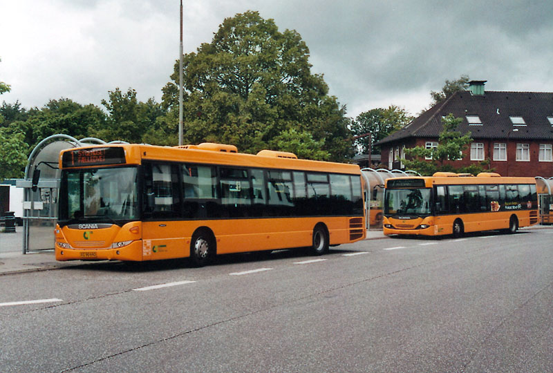 Die zum französischen Keolis-Konzern gehörende Firma City-Trafik setzt in Fredericia ganz überwiegend Scania OmniLink ein. Mit dem Wagen 147 steht hier die aktuelle Bauform vor einem älteren Exemplar an der Zentralhaltestelle vor dem Bahnhof. | ||