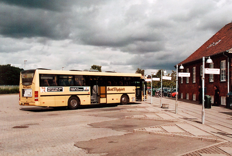 Die Regionalbusse haben am Bahnhof von Horsens einen eigenen Busbahnhof, der interessanterweise zwischen Bahnhofsgebäude und den verbliebenen Bahnsteigen liegt. Auch hier dominiert Bent Thykjær den Regionalverkehr, im Bild ein Scania OmniLine. | ||