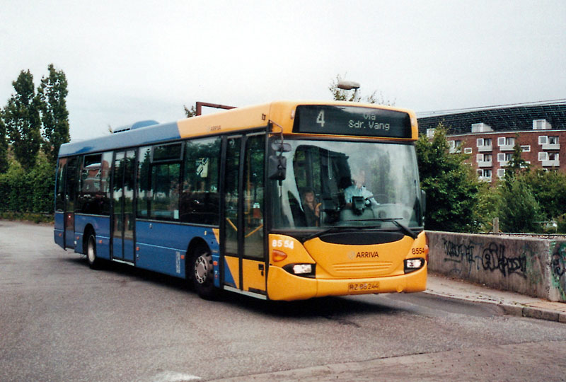 Weit verbreitet ist in Dänemark der Scania OmniLink, der als Low-Entry-Bus in vielen Stadtverkehren eingesetzt wird. Auch Arriva setzt in Kolding solche Fahrzeuge ein - wie den Wagen 8554, der im Bild die Zentralhaltestelle erreicht. | ||