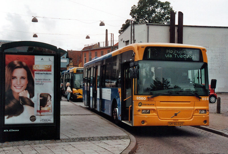 In wenig attraktiver Umgebung liegt die zentrale Umsteigehaltestelle der Stadtbuslinien in Kolding am Rande der Fußgängerzone. Dort steht mit dem Wagen 8560 von Arriva ein Volvo B12BLE mit Säffle-Aufbau zur Abfahrt bereit. | ||
