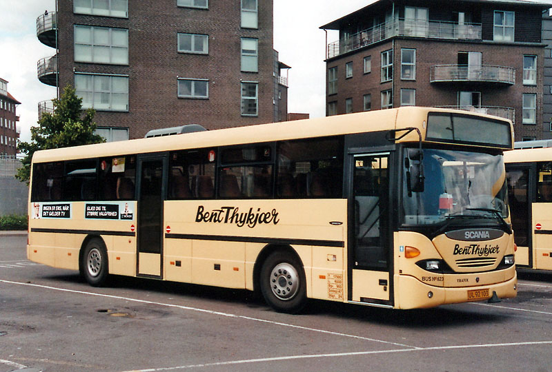 | Zahlreiche Regionalbuslinien um Vejle betreibt die ebenfalls zu Arriva gehörende Firma Bent Thykjær. Dafür stehen vor allem zahlreiche Scania OmniLine zur Verfügung. Mit dem Wagen 623 wartet einer dieser Hochflur-Überlandbusse am Busbahnhof auf die nächste Fahrt. | ||