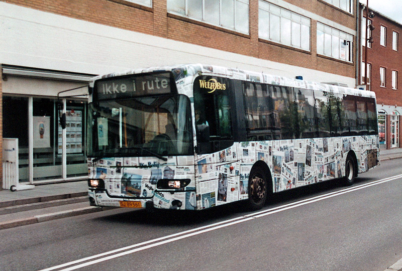 | Sehr selten sind Vollwerbungen, lassen die Vorgaben der Regiegesellschaften zur Lackierung der Fahrzeuge doch in der Regel nur kleinteilige Werbungen zu. Eine Ganzgestaltung der örtlichen Zeitung trägt allerdings dieser Volvo B12BLE mit Säffle-Aufbau. | ||