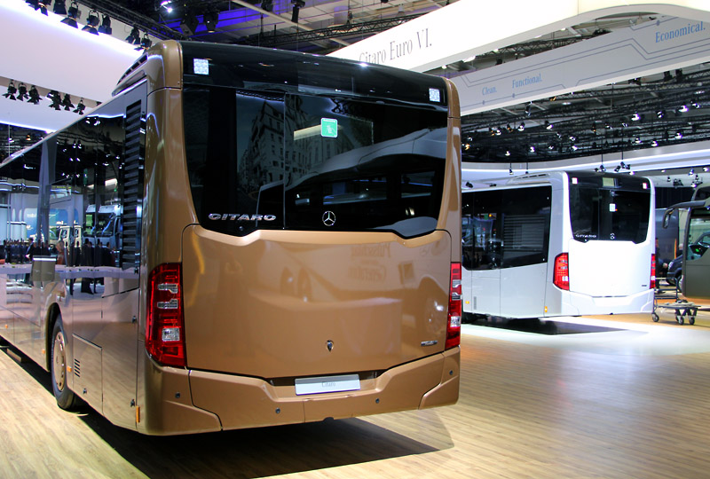 Mercedes-Benz Citaro - Heckansicht im Vergleich: links mit liegendem, rechts mit stehendem Motor.