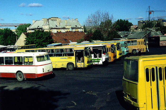 LITAUEN - Vilnius (September 1997): Bunte Ikarus-Versammlung am Überlandbushof.