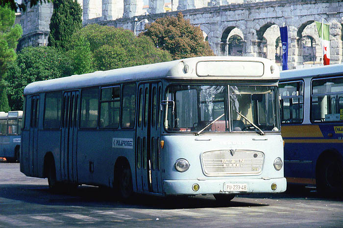 | JUGOSLAWIEN - Pula (Oktober 1985): Beim Verkehrsbetrieb „Pulapromet“ der heute zu Kroatien gehörigen Stadt Pula gab es einige dieser „MAN-Metrobusse“, die von Ikarus-YU montiert wurden. Man beachte die seltsame dritte Tür! | ||