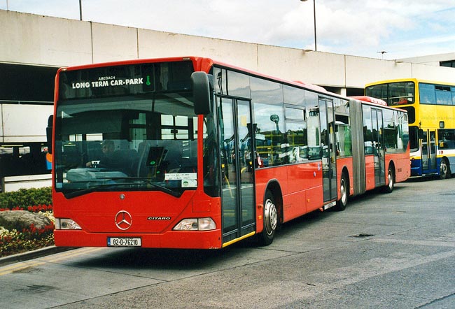 Eine der drei Pendellinien zu den Parkplätzen am Flughafen Dublin, die von Aircoach betrieben werden, wird mit Gelenkbussen bedient. Neben den Volvo B7LA kommen hier auch die EvoBus Mercedes-Benz O 530 G zum Einsatz, die das Unternehmen besitzt. Die Gelenkniederflurbusse verfügen über drei Türen, im Bild Wagen B8 am Terminal des Flughafens. |