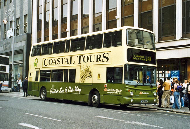 Für die Rundfahrten entlang der irischen Ostküste tragen zwei Volvo B7TL von Dublin Bus eine gesonderte Lackierung. Dennoch kommen die Busse gelegentlich auch im normalen Linienverkehr zum Einsatz - so hier AV91, der im Einsatz auf der Linie 14A auf der D'Olier Street aufgenommen werden konnte. |