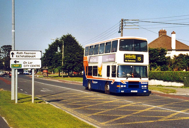Für Irland typisch sind Straßenschilder wie dieses auf der Firehouse Road im Stadtteil Knocklyon, das die Ziele sowohl in Irisch als auch in Englisch ausweist. Auf der Linie 15 unterwegs ist ein Volvo Olympian, dessen zweisprachige Beschilderung allerdings wegen eines schlecht eingestellten Zielfilms nicht vollständig lesbar ist. |