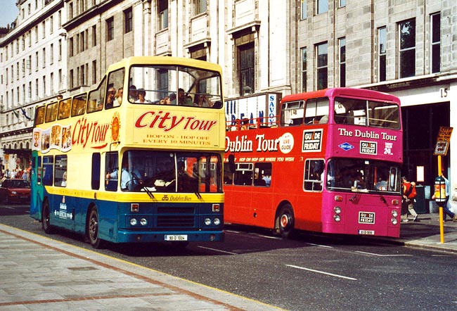 Einer der ältesten Leyland Olympian von Dublin Bus ist der 1990 gebaute RH4. Der Bus ist aus dem Liniendienst ausgeschieden und wurde seines Dachs beraubt, um im Stadtrundfahrtverkehr eingesetzt werden zu können. Der Bus war auf der O'Connell Street neben einem Fahrzeug des Konkurrenzbetreibers Dualway unterwegs, als dieses Bild entstand. |