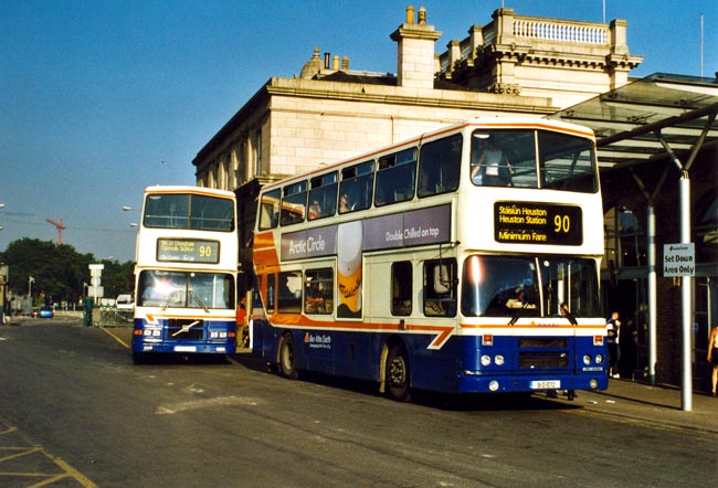 An der westlich der Innenstadt gelegenen Heusten Station waren, als diese Aufnahme entstand, soeben zwei Busse der die Bahnhöfe Dublins verbindenden Linie 90 angekommen. Rechts im Bild ist einer der ältesten im Sommer 2003 noch eingesetzten Busse, der 1991 in Dienst gestellte Leyland Olympian mit der Nummer RH72 zu sehen. |