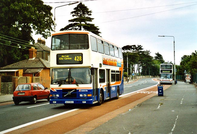 Auf der Malahide Road stadteinwärts unterwegs ist hier der Volvo Olympian mit der Wagennummer RV423. Der Bus befährt dabei eine der seltenen Busspuren in Dublin, während im Hintergrund ein Volvo B7TL Fahrgäste an einer Haltestelle aufnimmt. In Dublin ist es alltäglich, dass es ständig längere unplanmäßige Taktlücken gibt und danach zwei oder drei Busse gleichzeitig kommen. |