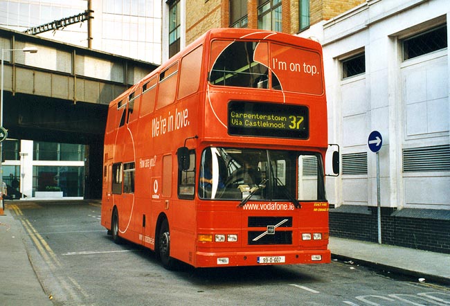 In dieser Aufnahme des Volvo Olympian mit der Nummer RV607 sind sämtliche am und im Fahrzeug zu findenden Informationen bezüglich des Fahrtziels und Unterwegshalten zu sehen, da außer auf den Frontzielanzeigen keine solchen Informationen den Fahrgästen geboten werden. Der Doppelstockbus ist einer von etwa einem halben Dutzend, die Vollreklamen tragen; RV607 wirbt dabei für einen Mobilfunkbetreiber. |