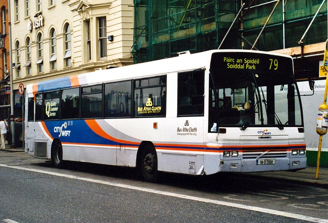 Nur neun Volvo B10B, sämtlich mit Aufbauten von Alexander (Belfast), besitzt Dublin Bus. Einer dieser 1996 in Dienst gestellten Hochflurbusse ist VA8, der hier am Aston Quay auf seine Abfahrtszeit wartet. Der Bus trägt die Anfang der 90er Jahre eingeführte ‚CitySwift'-Farbgebung. |