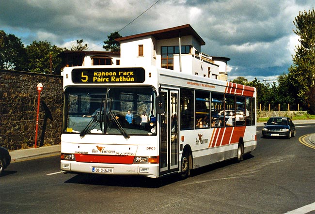 | Dennis Dart SLF mit Plaxton-Aufbauten gehören zu den häufigsten Niederflur-Midibussen auf den britischen Inseln, und auch Bus Éireann setzt solche Fahrzeuge ein. In Galway kommt so der 2000 gebaute DPC3 zum Einsatz, der auf der University Road zu sehen ist. |