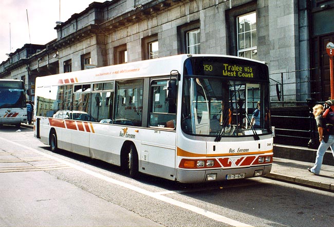| Ausnahmsweise kommen immer wieder Niederflurbusse auf Strecken zum Einsatz, auf denen aufgrund der Reiselänge und der Gepäckbeförderung eigentlich Reisebusse verwendet werden sollen. Im Busbahnhof von Galway stand so im August 2003 mit DWR15 ein Niederflurmidibus des Typs DAF SB120 zur über fünfstündigen Fahrt als Expressway-Linie 50 nach Tralee bereit. |