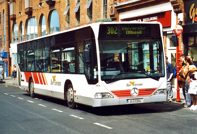 | In Limerick halten die Stadtbusse an keiner zentralen Haltestelle, sondern vielmehr über verschiedene Straßen in der Innenstadt verteilt und dadurch weit vom Busbahnhof für den überregionalen Verkehr entfernt. Der EvoBus Mercedes-Benz O 530 mit der Nummer MC6 steht auf dem Weg zur Universität in der William Street. |