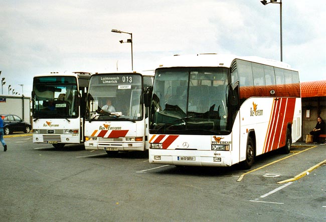 | In Limerick besitzt der Busbahnhof weder einen Wartesaal noch eine durchgehende Überdachung und befindet sich generell in einem schlechten Zustand. Drei Reisebusse warten hier auf ihre Abfahrt, darunter rechts mit MH11 ein Mercedes-Benz O 404 mit Hispano-Aufbau. |