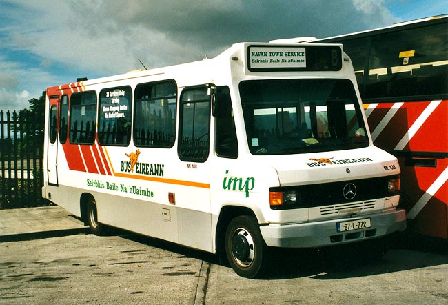 | Im Stadtverkehr Navan wird der Mercedes-Benz 709D mit der Nummer ML108 eingesetzt. Der Kleinbus, dessen Aufbau von Leicester Carriage Builders hergestellt wurde, stand im Bus Éireann-Betriebshof Broadstone in Dublin, wo er sich zu Wartungsarbeiten befand. |