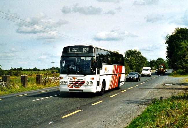 In der Nähe von Craughwell im Osten der Grafschaft Galway entstand dieses Foto eines DAF MB230 von Bus Éireann, der von Dublin kommend auf der nach Westen führenden Hauptstraße unterwegs war. Da Autobahnen fast überhaupt nicht existieren, benutzen die Busse das schlecht ausgebaute Netz an Landstraßen. |