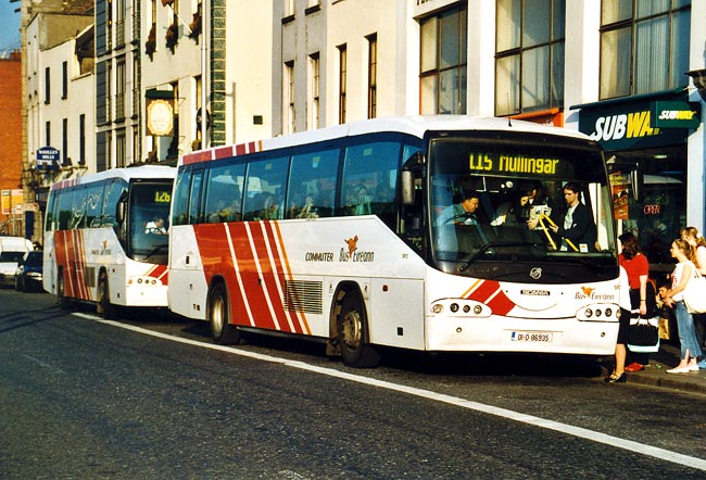 | In der abendlichen Hauptverkehrszeit entstand dieses Bild von zwei Scania L94, die am Wellington Quay am Ufer der Liffey in Dublin hielten, um Berufspendlern die Rückfahrt von der Arbeit zu ermöglichen. |