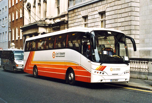 | Ein Teil der im Sommer 2003 in Dienst gestellten Volvo B12B, deren Aufbauten vom portugiesischen Hersteller Caetano stammen, wird für CIÉ Tours International eingesetzt und trägt eine entsprechende Lackierung. Das Bild zeigt VC309 in der Kildare Street in der Innenstadt von Dublin. |