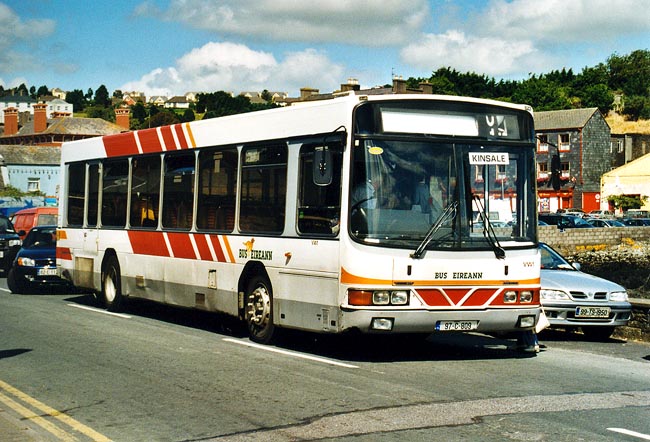 | Als erstes von vier gleichzeitig verkehrenden Fahrzeugen ist VW1 von Cork kommend in Kinsale angekommen und hält auf der Pier Road. Der Volvo B10B mit Wright-Aufbau befindet sich, obwohl erst sechs Jahre alt, in einem erbärmlichen Zustand - da auch die Zielanzeige nicht funktioniert, ist hier auch die Verwendung von Papierzetteln zur Beschilderung zu beobachten. |