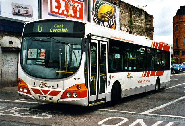 | Nur in Cork halten die Stadtbusse auch am Busbahnhof für den überregionalen Verkehr. Der 2002 in Dienst gestellte Volvo B10L mit der Nummer VWL132, der einen Aufbau von Wright besitzt, verbrachte dort zum Aufnahmezeitpunkt eine Pause. |