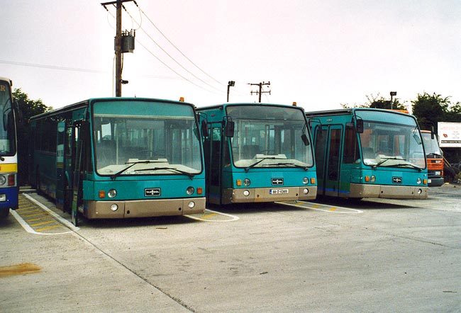 Mehrere Flughafen-Vorfeldbusse vom Typ Van Hool AP500 bietet Bernard Kavanagh zum Verkauf an. Die Busse, die vorher für Aer Lingus vermutlich am Flughafen der Hauptstadt Dublin im Einsatz standen, wurden 1988 in Dienst gestellt und verfügen über Türen auf beiden Fahrzeugseiten. Drei dieser kuriosen Fahrzeuge sind hier auf dem Kavanagh-Hof in Urlingford zu sehen. |