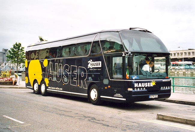 Beispielhaft für deutsche Reisebusse in Irland steht dieses Bild eines Neoplan N 516/3 SHDC, das am River Lee in Cork entstand. Der Bus gehört dem Rottweiler Unternehmen Hauser und trägt das Kennzeichen RW-BF 274. |