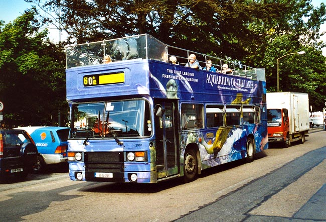 Noch mit originaler Werbung und Wagennummer ist der von Stagecoach North West in England übernommene Leyland Olympian von O'Neachtain aus Spiddal im Stadtrundfahrtverkehr von Galway unterwegs. Der Bus, dessen Aufbau von Eastern Coach Works gefertigt wurde, war zum Zeitpunkt der Aufnahme bereits 22 Jahre alt, teilte sich aber den Stadtrundfahrtbetrieb mit einem 40 Jahre alten Leyland Titan. |
