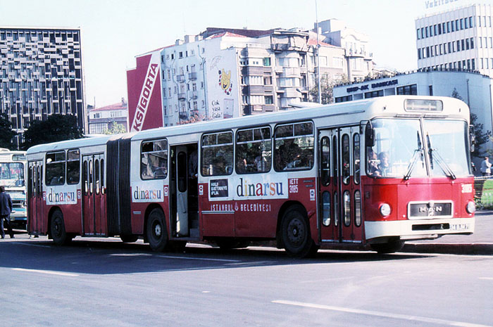 MANAŞ-Gelenkbus Nr. 3185 am Taksim-Platz. Man beachte die vier Falttüren (Okt. 1988).