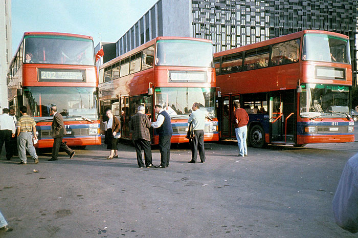 Gleich drei moderne Doppeldecker: Nr. 93-053, 94-053 und 94-055 am Taksim-Platz (Okt. 1994).