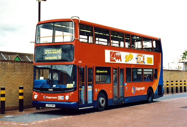 | Auch wenn die Gelenkbusse sicherlich die auffälligsten Neufahrzeuge in London sind, machen sie nur einen sehr kleinen Teil der Neubeschaffungen aus. Die überwiegende Zahl der Neufahrzeuge sind normale Eindecker und Doppeldecker, wobei letztere auch die hauptsächlichen Nachfolger der Routemaster werden dürften. Erst wenige Wochen im Einsatz war Wagen 17895 von Stagecoach East London, der 895. Dennis Trident mit Alexander-Aufbau, den Stagecoach in den letzten fünf Jahren für seine beiden Londoner Betriebe beschafft hat. Die Aufnahme zeigt den Bus am U-Bahnhof Leytonstone im Osten des Londoner Großraums. | ||