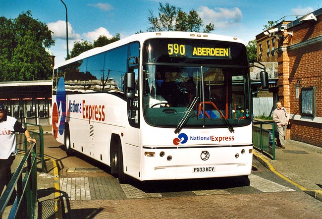 | Vom Reisebusbahnhof Victoria Coach Station mitten in London aus bietet das National Express-Netz planmäßige Reisebus-Verbindungen in alle Regionen Großbritanniens, die in London teilweise ebenfalls an in den Vororten gelegenen U-Bahnhöfen halten. Im Busbahnhof Golders Green ist 53020 von Stagecoach North West zu sehen, ein 2003er Volvo B12M mit Plaxton-Aufbau. Der Reisebus befindet sich dabei am Anfang seiner Fahrt ins schottische Aberdeen, das planmäßig etwa zwölf Stunden später erreicht wird. | ||
